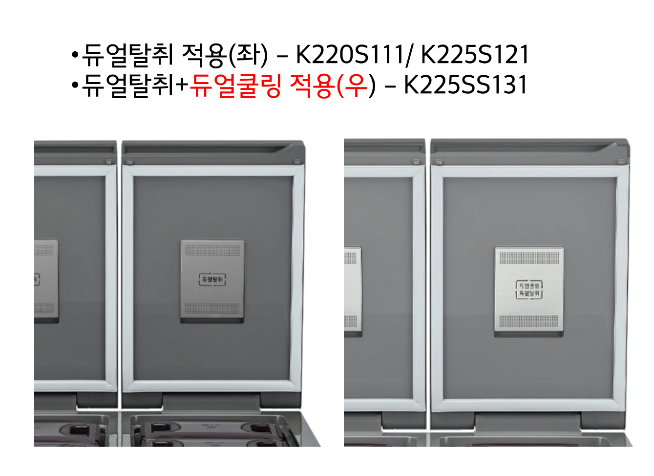 ✅K220S111 메탈 퓨어 / 1등급 좌칸 냉동전환 가능 / 김치통 8개 ✅K225S121 메탈 퓨어 / 1등급 좌우칸 모두 냉동전환 가능 / 김치통 9개 ✅K225SS131 메탈 샤이니 퓨어 / 1등급 좌우칸 모두 냉동전환 가능 / 김치통 9개 듀얼쿨링
